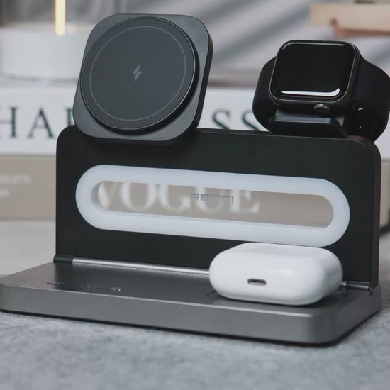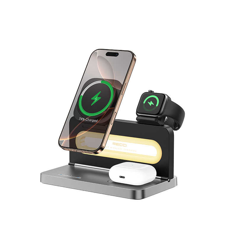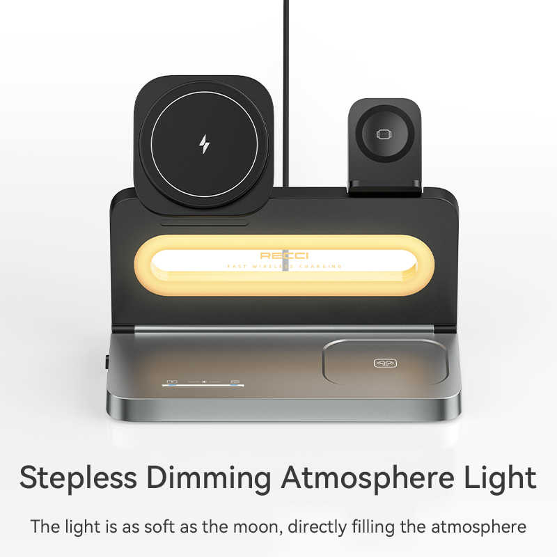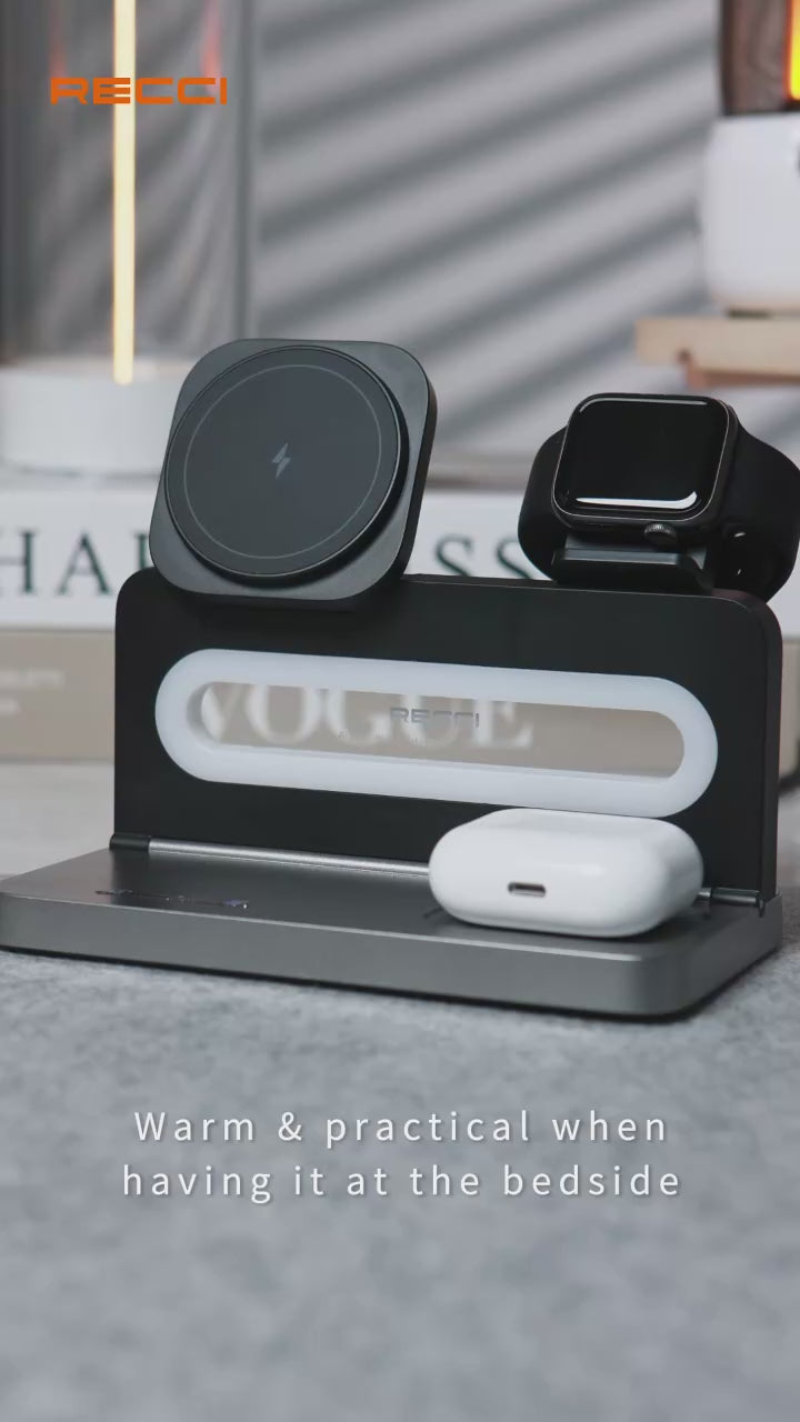 RECCI 4-IN-1 Wireless Charger with Ambient Light Portable Folding Charger 15w Magnetic Charger for iPhone iWatch Earbuds